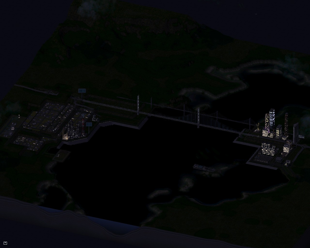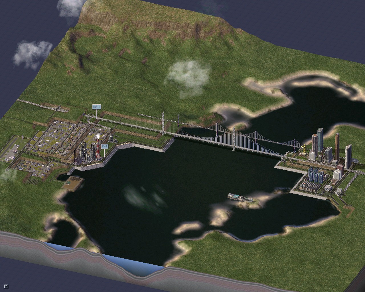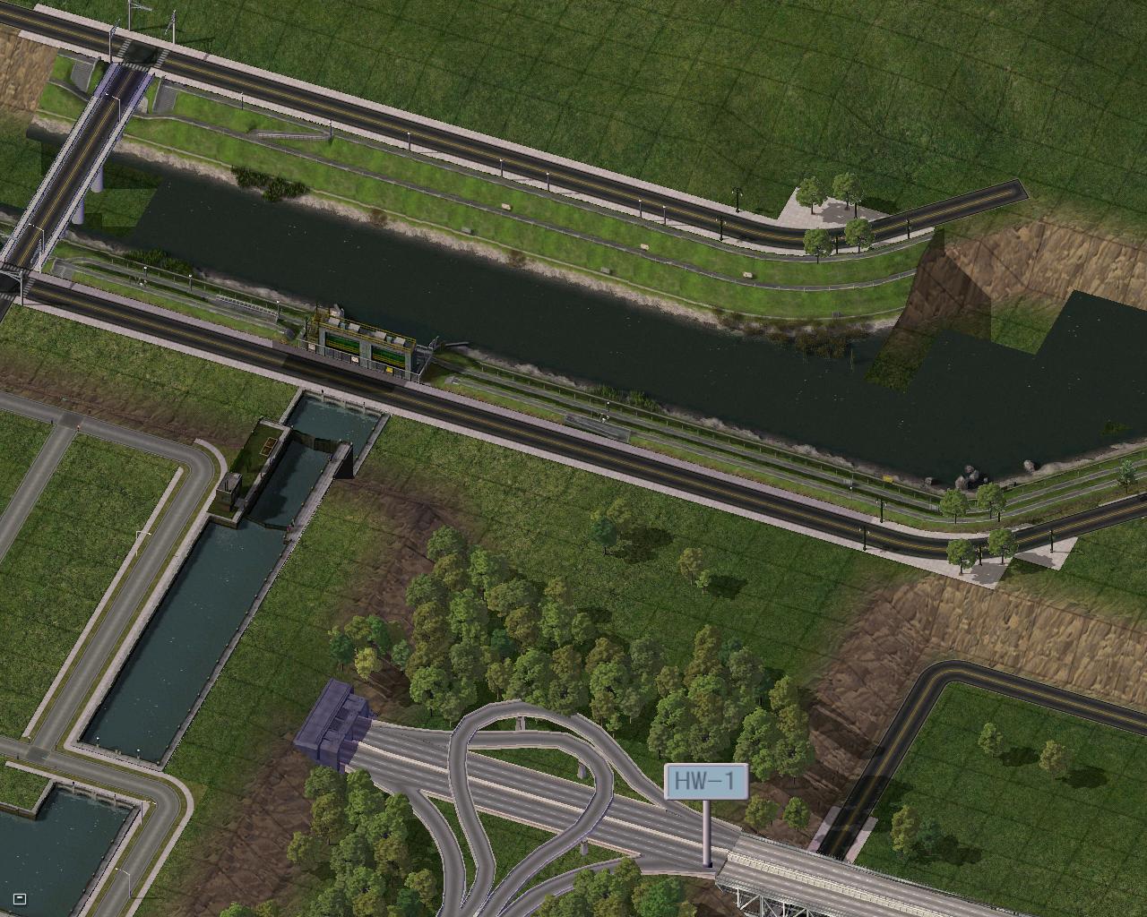巨大な橋の横に川を作りました。シムトロWiki 副管理人さんのものです。